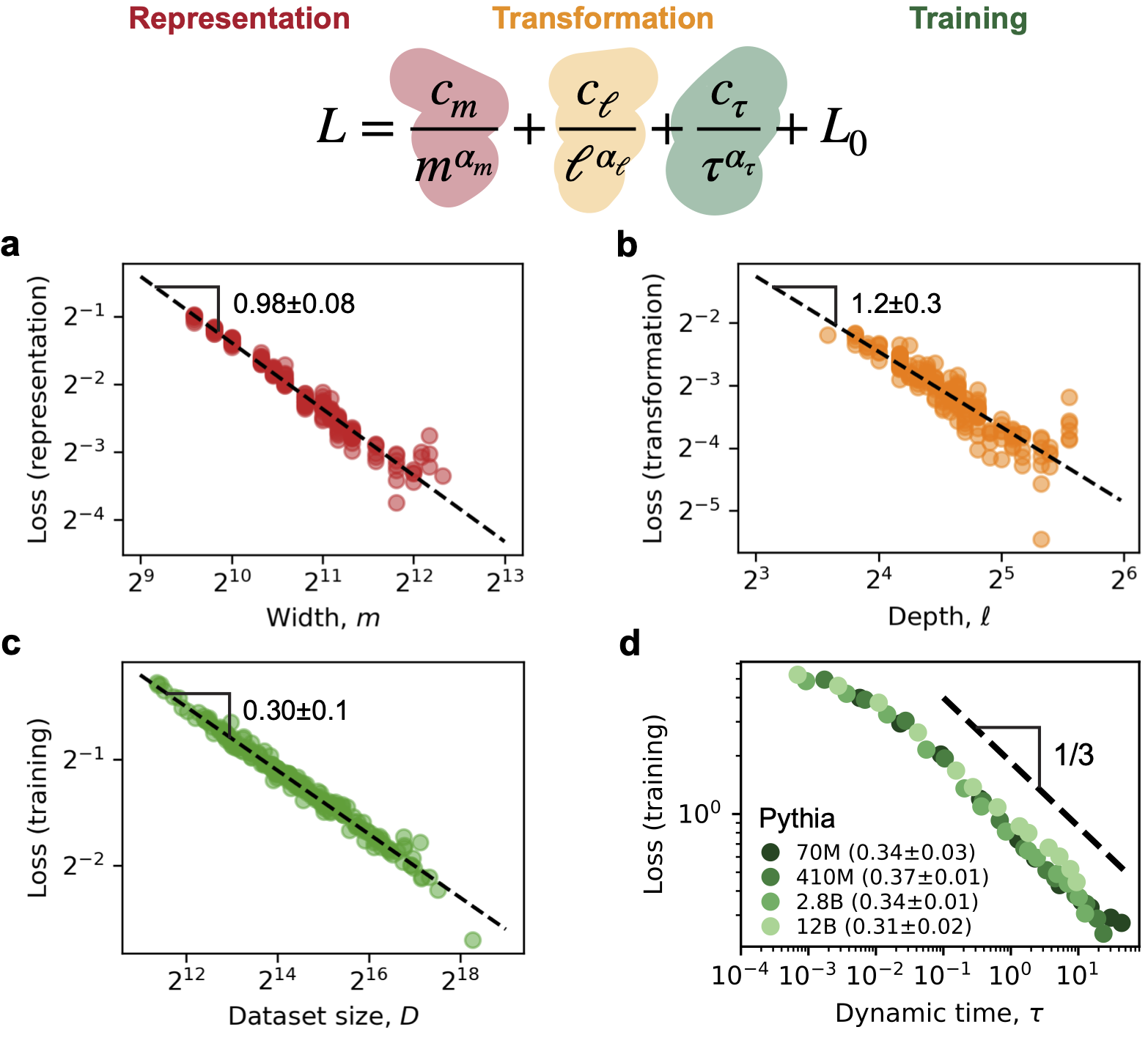 A semi-empirical formula.—Conceptually, we gathered: (i) With no error due to transformation or training, the loss due to imperfect representation is related to width as $\sim m^{-1}$; (ii) With perfect representation and training, the loss due to imperfect transformation is mainly a power law with depth $\ell$; (iii) With sufficiently large model size, the loss converges as $\tau^{-1/3}$. To combine all, we proposed a formula summing the three power laws in the same spirit as the Chinchilla scaling laws: