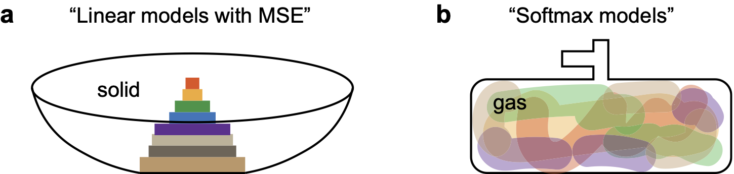 To have a heuristic comparison, we argue that linear models with MSE are baskets trying to contain solid bricks (features). The baskets can only contain a limited number of bricks, and the bricks are learned in a power-law order (Figure 2a). LLMs, on the other hand, are non-linear models with softmax—more like a bottle trying to compress different kinds of gases (features). The bottle can have all kinds of gases (superposition), and the speed of learning is limited by the valve (softmax and cross-entropy) rather than gas fractions (Figure 2b).